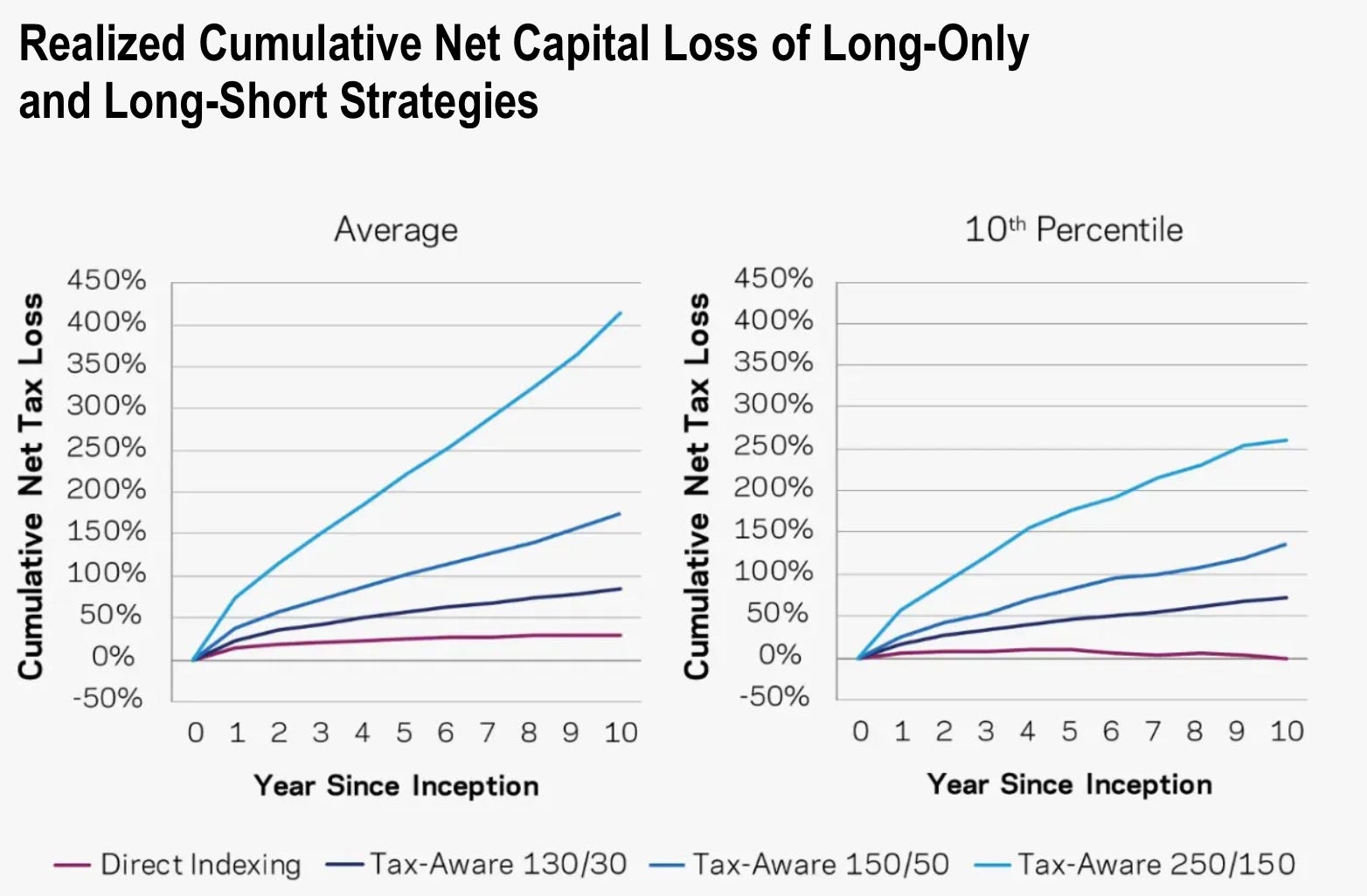Although the point of a long/short strategy is outperformance, the incidental tax benefits are substantial. This chart shows that, after 10 years, the average cumulative net tax losses of a highly leveraged long/short strategy were greater than 400% of the contributed capital, compared to less than 50% for direct indexing.