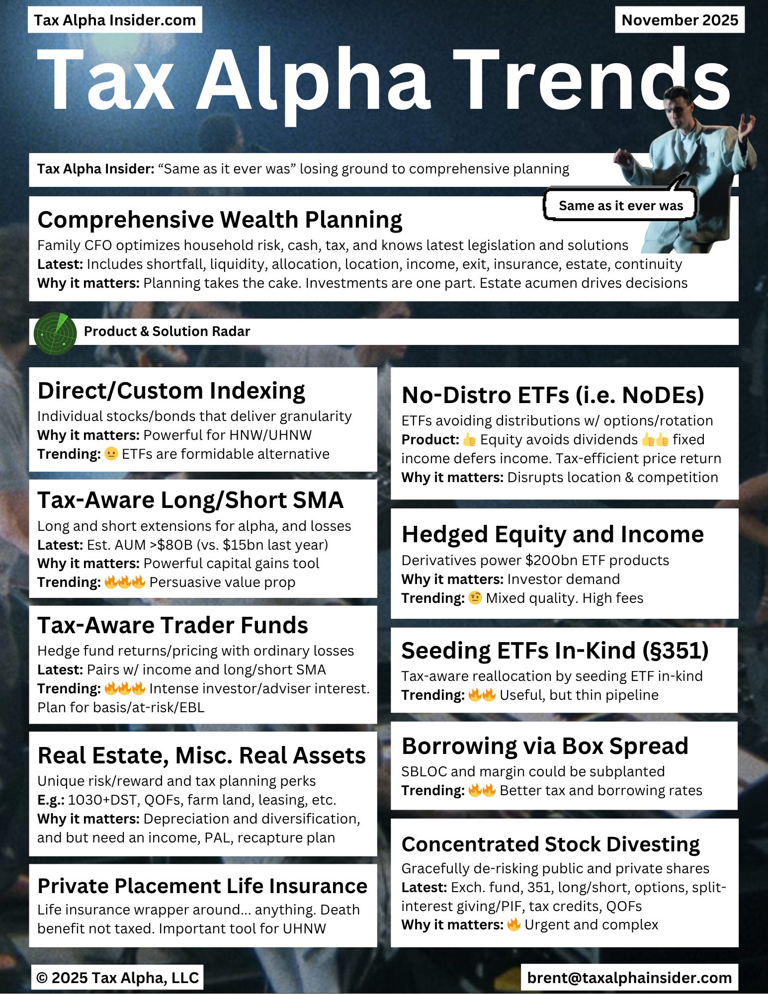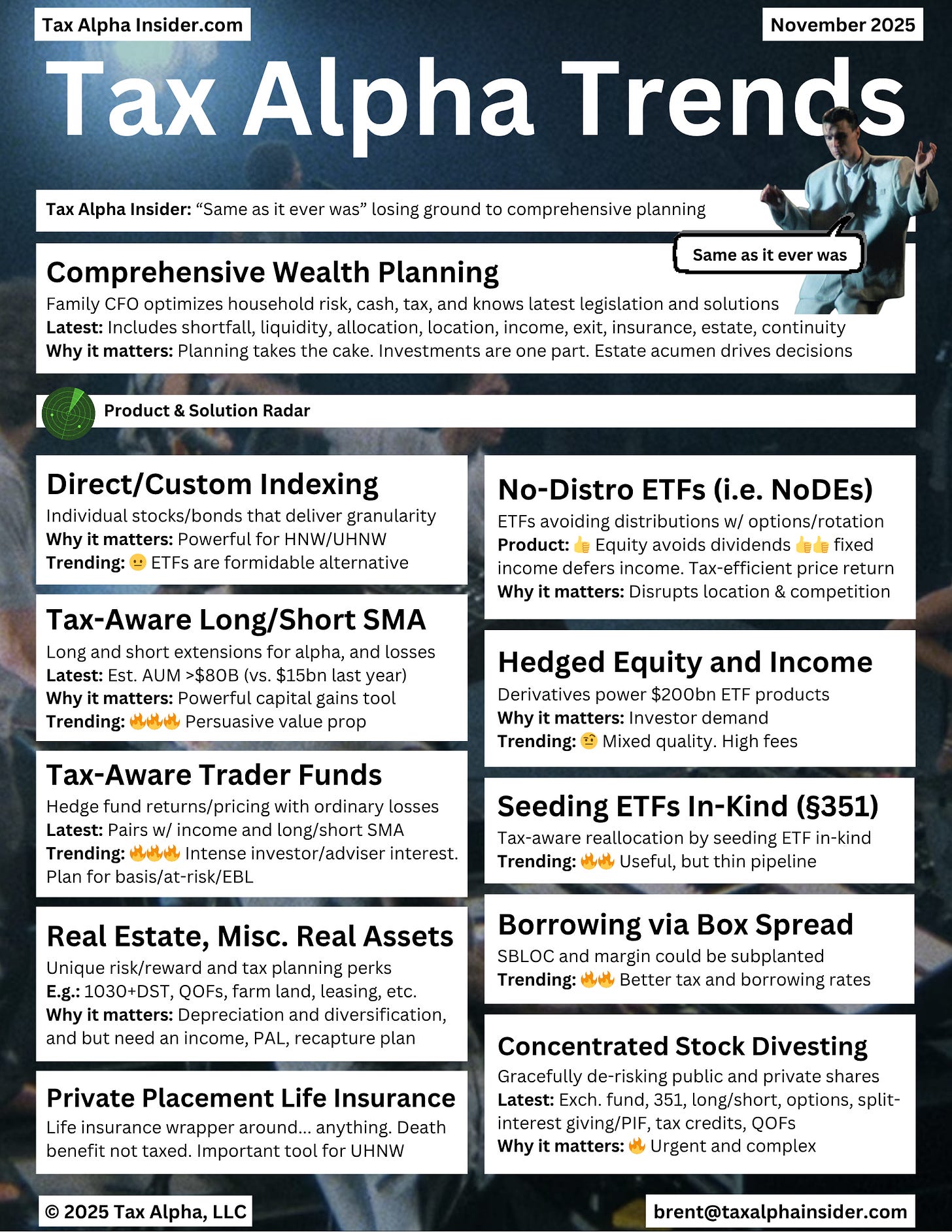 So, above is the latest issue of Tax Alpha Trends, which enshrines comprehensive wealth planning and updates my (far from comprehensive) product and solution radar.