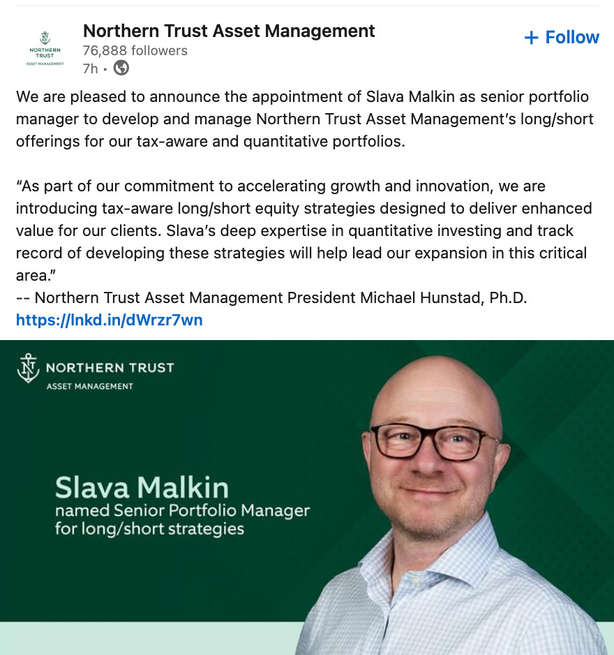 Slava Malkin (former BlackRock/Aperio) joins Northern Trust as a portfolio manager “to develop and manage Northern Trust Asset Management’s long/short offerings for our tax-aware and quantitative portfolios.”