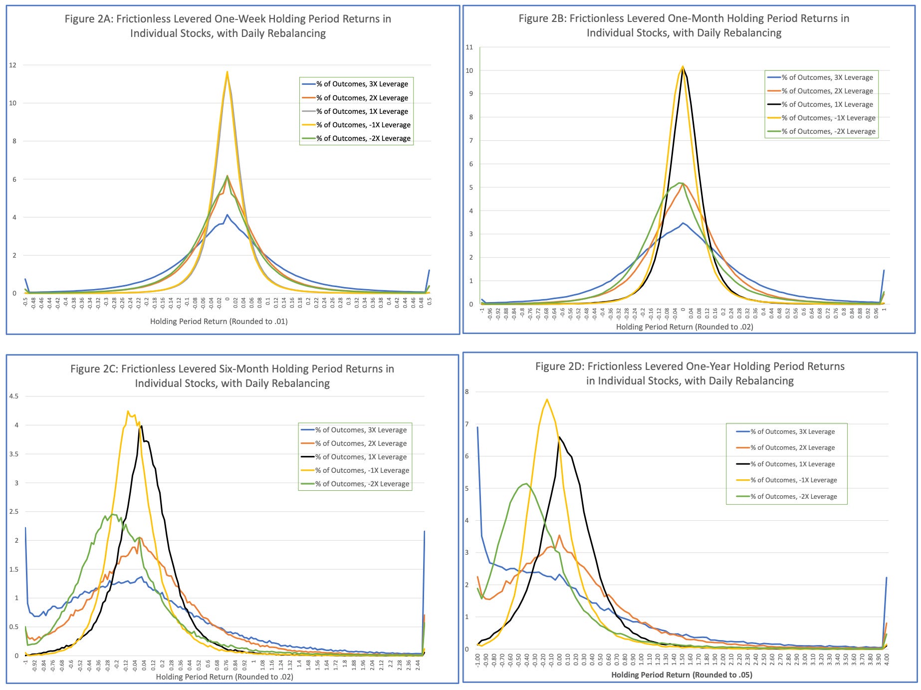 As the investment holding period gets longer, the distribution of returns for levered single-stock ETFs becomes dramatically more volatile and positively skewed (this means the median is usually below the mean).
