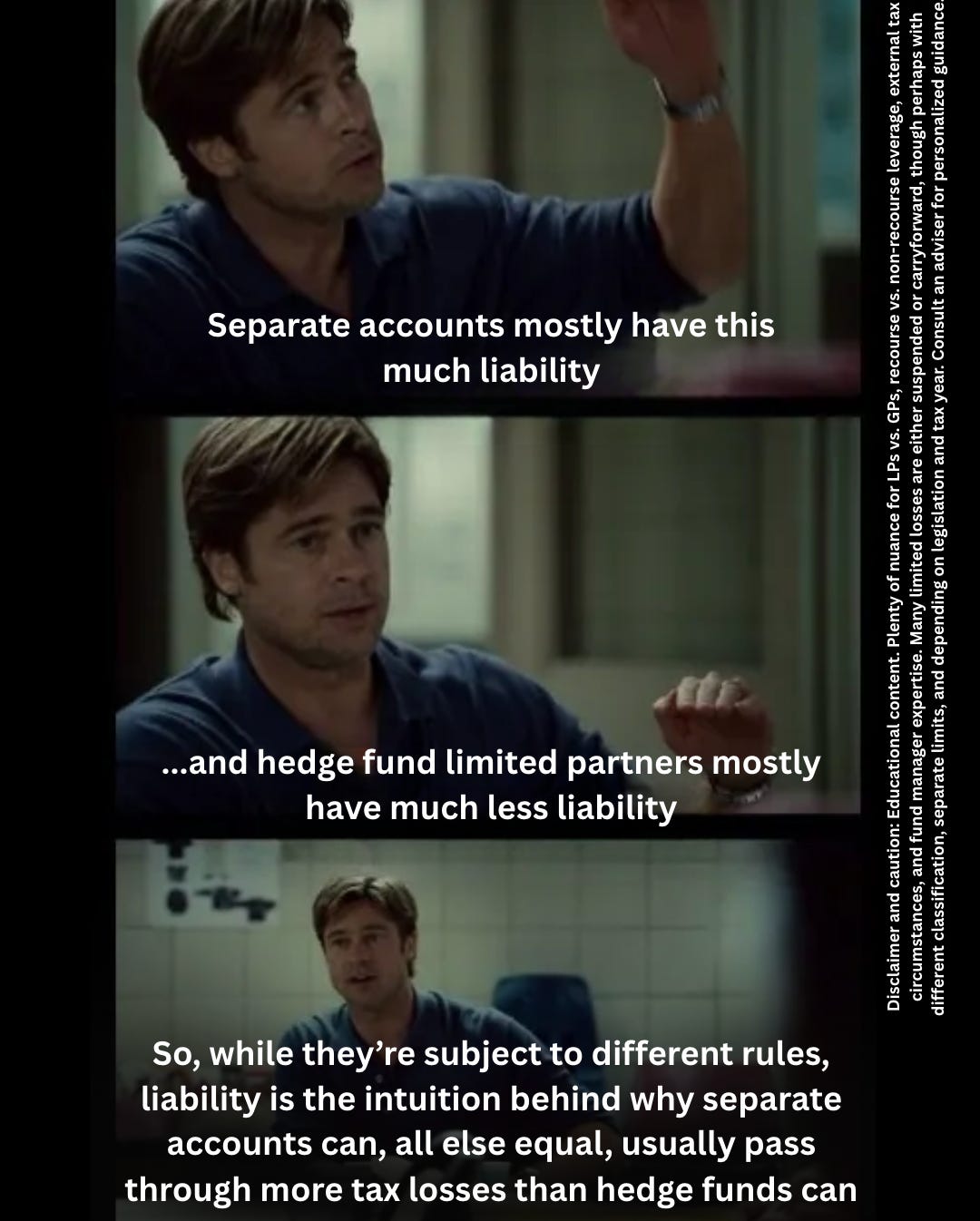 I am not suggesting that separate accounts are subject to the same rules as hedge funds organized as partnerships. They generally are not. But I think we can build some intuition about separate account taxation using the hedge fund rules.