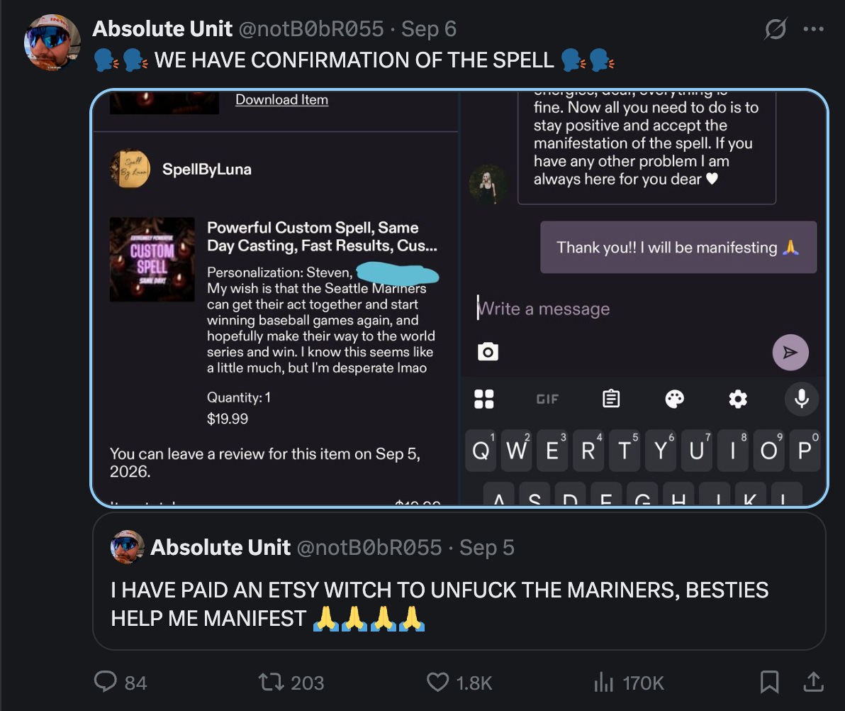 Random guy bought a spell (yes) on Etsy for $19.99 and the mariners are 5-0 since.