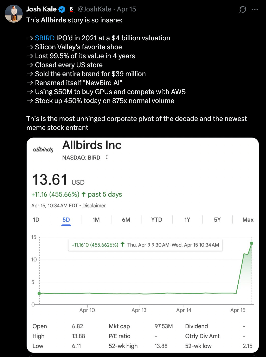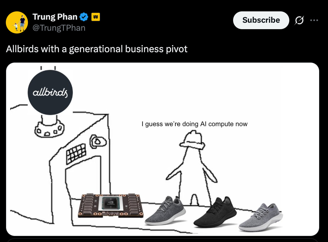 So, you can imagine my (and everyone’s) surprise when Allbirds belly flopped, then abruptly pivoted to… AI infrastructure.