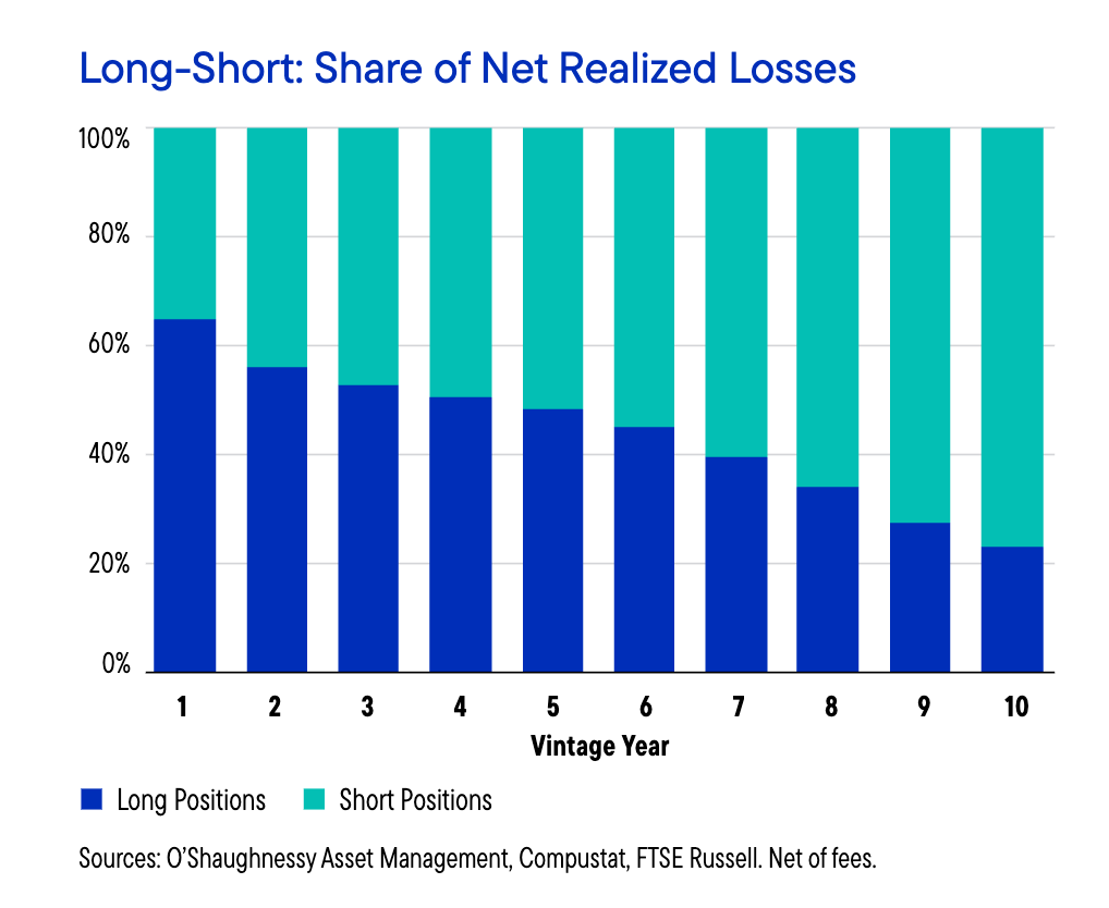 Tax Alpha Insider commentary: Tax-Aware Long/Short is an active strategy first and foremost, and a compelling risk management strategy too (e.g., in concentrated stock scenarios), and it’s also a powerful tax planning tool. The visual above shows how tax-loss harvesting short positions over time dominates the overall composition of losses harvested.