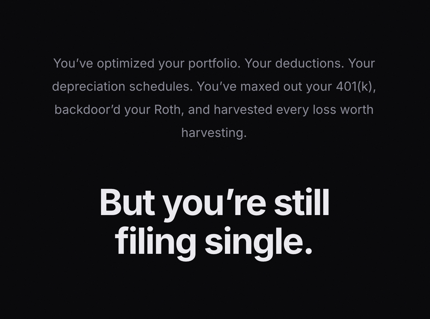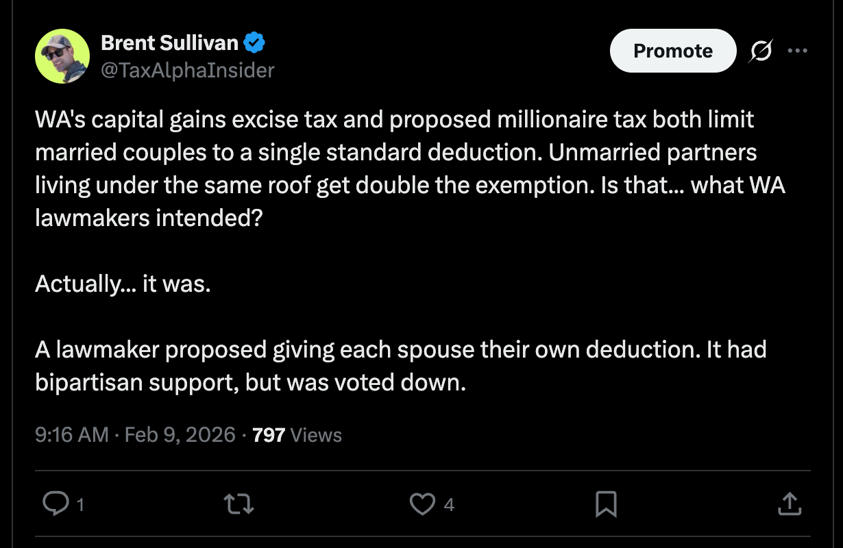 Related to your Washington state capital gains comment, there's a similar dynamic for the federal State and Local Tax deduction, where single households and joint households get the same SALT cap. In addition, getting married also means that the combined income gets applied to the same phase out amount. So there can be situations where two people can get married and the combined SALT deduction goes from $80,000 to $10,000. And because of that, I've told a lot of high income non-married couples to run the tax math before deciding to get married. (Important: I don't recommend making a decision on marriage based on tax deductions.)